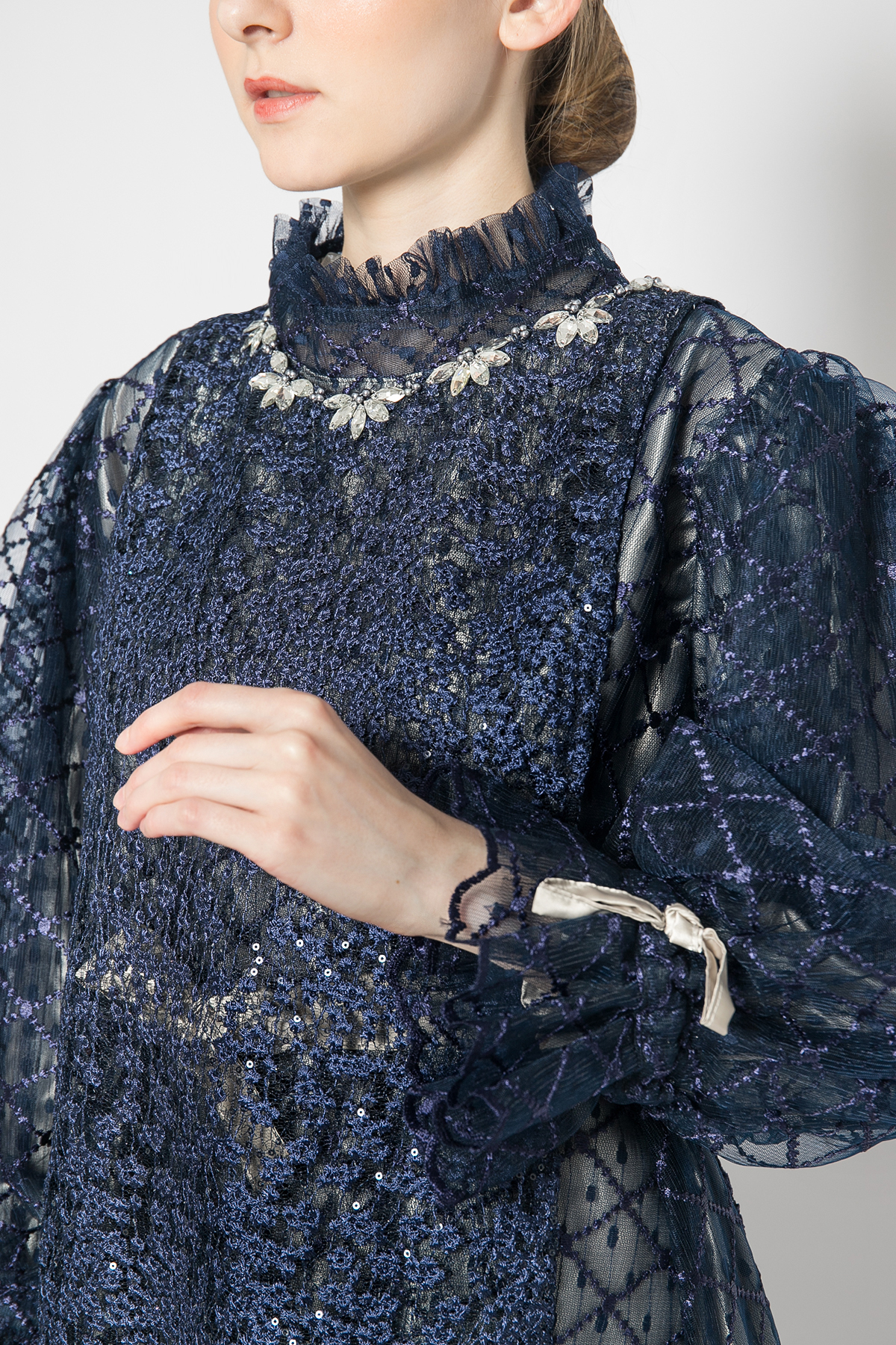 Two-pieces loose cut maxi dress consist of delicate embroidered tulle with long sleeves details and premium satin maxmara as the lining. Mesmerizing beadwork details on the neckline.